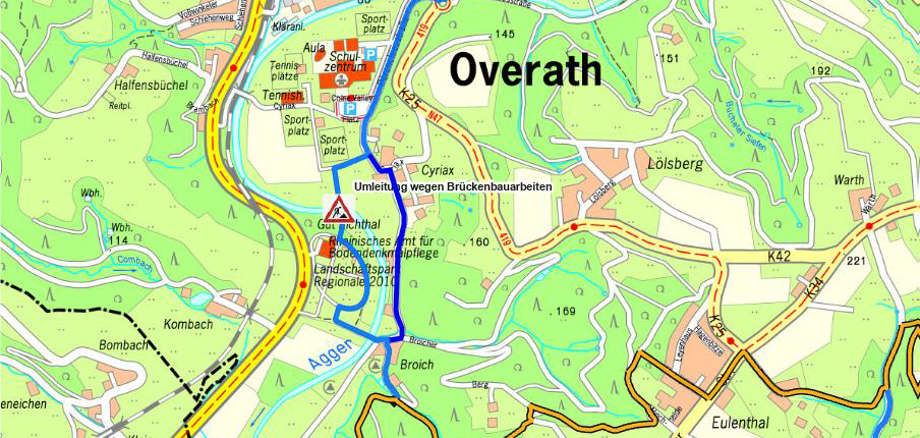 Für diesen Streckenabschnitt wurde eine Umleitung eingerichtet, die die ausgeschilderten Wanderwege (Zuwegung Bergischer Wanderweg und A1) um die Baustelle herumführt. Wir bitten darum, diese alternative Route zu nutzen, um Ihren Weg weiterhin bequem und sicher fortzusetzen.